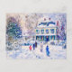 Impressionistisk målning av människor och barn som leker i en snöig trädgård framför ett hus på vintern.
