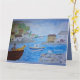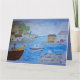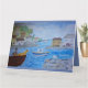 Quirky Harbour med en man och en lycklig-hund på en båt, en gul och färglös byggnad. Lägg till text i valfritt område/sida av kortet. Helt anpassade.
