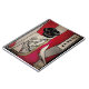 På en patriotisk bakgrund, som visar strålarna från Japan stigning sol flagga, visar en kvinna med geisha-hårstil tillbaka henne, dekorerad av japanska stil tatueringar.