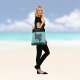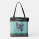 This beach theme tote bag features intricate ink style retro artwork of a manta ray against a light teal green faux brushed metal background. The manta ray is rendered in an intricate, stylized line-drawing technique reminiscent of vintage New Zealand Maori art, giving it a bold and contemporary look. Black, gray, and darker green bands provide a stylish look, and your personalized name appears in light green text on black at the top.