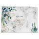 Marble stone skrivs ut som bakgrund. Dekorerad med vattenfärgade eukalyptus greenery och guldblad. Anpassa och lägg till ett datum och namn i brudgummen. Grått och guldtext. Perfekt för presentemballering eller för tjänster.