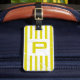 märkre med läderband: blockera monogram på marmorerad gult, mönstrad bakgrund