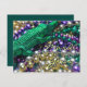 Fotografi av färgglada Carnaval-pärlor. Färgerna för Mardi Gras (guld, grön, lila) visas i en stor grön alligatorpärl som ramar in fotot. Framsidan på inbjudningskortet visar "Mardi Gras". Baksidan på inbjudningskortet har "Laissez les bon temps rouler!" som hälsning och utrymme för att lägga till dina personliga detaljer för den anpassade Carnaval-fest-inbjudan. Alla ord på kortet kan anpassas efter behov.