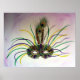 Vattentärsfärgning med mjuka pastellberöring av en ludd av Mardi Gras-mask. Användorna den traditionella Mardi Gras färg av lila, grönt och guld. Två fjädrar i påsen högst upp på masken.