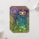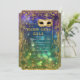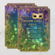Vill du ha en elegant, festlig Mardi Gras Galafest inbjudan som är klassisk och vacker? Denna design har en gnistrande glitterlook ramkant och vintage stil guldbroderad, pärlad mask (OBS: detta är en platt tryckt inbjudan, det finns ingen faktisk guldglitter eller metallfolie eller bläck som används) över en djup rik bokeh-gnista, tindrande ljus bakgrund i djup, rik lila, blå, aqua och grön.