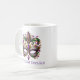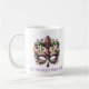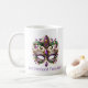 This ceramic coffee mug is shown with Mardi Gras images, Text of "Let the good times roll' is beneath the prints.