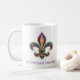 This ceramic coffee mug is shown with Mardi Gras images, Text of "Let the good times roll' is beneath the prints.