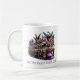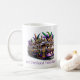 This ceramic coffee mug is shown with Mardi Gras images, Text of "Let the good times roll' is beneath the prints.