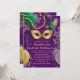 Festive all age mardi gras mask födelsedagsfest inbjudan med en guld-mask med faux-glitter utseende grönt, guld- och lila-fjädrar och grönt-bindningar, ballonger, pärlor, bokeh och mönster i bakgrunden. Oavsett om du firar i New Orleans fransk eller om du är i Tjocken Tisdag, så kommer du till Laissez Bon Temps Rouler med den här roligten maskerade inbjudningskorten i traditionen mardi gras färger. Bild © Krissy H. Studios, LLC. Alla höger reserverade.
