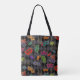 Den här Mardi Gras-väskan har ljusmaskerade masker i grönt, rosa, röd lila, turkos och orange mot bakgrund av svart och grått harlequin i diamant mönster. Designad av världsberömd konstnär ©Tim Coffey.