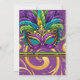 Fantastisk lila, akvamarin, grön och guld maskerad och Mardi Gras-fest inbjudan som du kan anpassa. Lägg till dina fests detaljer på framsidan. Mardi Gras-mask med fjädrar i akvamarin, grönt och Mardi Gras-guld med en lila och guld virvlad bakgrund pryder framsidan av denna inbjudan. Baksidan av kortet har samma illustration. Låt de goda tiderna rulla och ha kul på din fest! Njut!