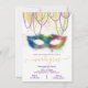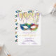 Moderna akvarell Mardi Gras-maskeradfestinbjudningar. Har en regnbågsfärgad mask, hängande pärlor och gulddammkonfetti i bakgrunden. Falskt guld.