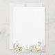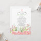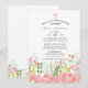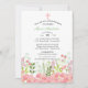 Mjuka rosa och gröna vilda blommor pryder undersidan av inbjudan. Utsmyckad med ett rosa och vitt kors.