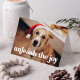 Söt hund-tematisk julkort med ditt husdjurs horisontella foto på framsidan med "uttryck glädjen" i fet vit bokstav. Personifiera julkortet för hund genom att lägga till en anpassad hälsning, ditt namn och ett anpassat meddelande. Baksidan av kortet har ett marint och vitt tryckmönster med tassavtryck.