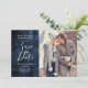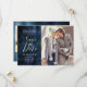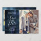 Elegant och modern spara datum-kort för ditt marinblå bröllop! Bakgrunden är gjord i vacker akvarell. Du kan lägga till dina egna förlovningsfoton. Lägg till datum, stad & land, webbplats etc. Detta kort är dubbelsidigt och på baksidan kan du lägga till ytterligare två bilder (fyrkantiga) och din bröllopswebbplats längst ner. Texterna är lätta att anpassa online.