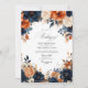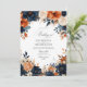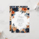 Marinblå, bränd orange och champagne blomsterbröllopsinbjudan. Perfekt för en trädgårdsbröllop. Denna fantastiska bröllopsdesign kombinerar rik marinblå, bränd orange och champagneblommor för en sofistikerad och modern look. Perfekt för höst- eller trädgårdsbröllop, den eleganta typografin på inbjudan förstärker den lyxiga känslan. Den varma och djärva färgpaletten sätter tonen för en oförglömlig fest, vilket gör den idealisk för par som vill införliva trendiga, stilrena element på sin stora dag.