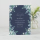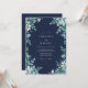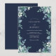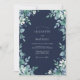 En djup marinblå bakgrund skapar en dyster ton för denna sofistikerade design, med eteriska akvarellbotaniska detaljer. Ömtåliga turkosa och salvia gröna vilda blommor, tillsammans med luftig lövverk och mjuka blomningar, skapar en naturlig skogsestetik. Denna eleganta palett fångar en lugn, målerisk atmosfär för en kvälls- eller säsongsbetonad vinterhändelse.