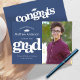 Meddela världen att din favoritstudent har nått sin milstolpe med detta fantastiska, enkla, moderna, personliga meddelande. Fet, grafisk, vit typografi och en ikon överlagrar en marinblå bakgrund. På höger sida läggs ett foto efter eget val. Anpassa den anpassade texten med din examen kandidat namn, skolans namn och avgångsår. På baksidan, under den feta "grattis" -grafiken, lägg till din personliga anteckning, nästa skola de går på osv. Matchande och koordinerande tackkort, möss-topp, fläktar, servetter, tallrikar, banderoller och andra examenspresenter finns också i denna trendiga och stilrena samling. Garanterat att tillföra stilig kul till deras speciella tillfälle!