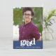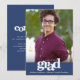 Var stolt, jubla och visa upp denna milstolpe för din favorit som har tagit examen! Skicka ut detta fantastiska, enkla, moderna, personliga fotomeddelande för en händelse att minnas. Fet, grafisk, vit typografi och ett marinblått band överlagrar ett foto du väljer. Anpassa den anpassade texten med din examenskandidats namn, skola och årskurs. På baksidan, under den feta "grattis"-grafik, lägg till din personliga anteckning, nästa skola de ska gå på – eller vad du vill dela. Matchande inbjudningar, tackkort, toppar för studentmössor, servetter, tallrikar och andra examenspresenter finns också i denna trendiga och stilfulla kollektion. Garanterat att tillföra stilfullt kul till deras speciella tillfälle!