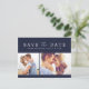 Få dina gäster att bli glada för din speciella dag med detta marinblå två-foto bröllops-kort för att spara datumet. Med dina livfulla bilder och stilrena texter kommer detta postkort säkert att fånga dina gästers blickar. Anpassa spara-datum-kortet med din text och dina foton med hjälp av mallen.