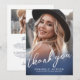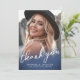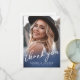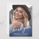 Det här enkla och minimalistiska tackkortet för examen har ett helsidesfoto på framsidan med en marinblå gradient längst ner för en ren och modern look. "Tack" visas i elegant handskriven stil, vilket skapar en tidlös design, med en subtil "Klass 2026"-detalj som ger en meningsfull examensberöring.