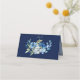 Eleganta blå och vita rosor pryder detta vackra blommiga platskort för kvällen som ska placeras vid receptionsbord. Den snygga falska guldskinnramen accentueras med vackra indigoakrylblommor och en vacker ljusgul botanisk kvist. Paret initialer skrivs i klassisk vit kursiv skrift på baksidan av detta moderna kort.