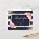 Elegant blomstergrafik tack-kort med akvarell rosaskymda blommor och förgylld grönska på en mörk marinblå och vit randig bakgrund. Matchande artiklar finns tillgängliga.