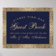 En vintage, elegant alfabetisk vigdskylt, rekommenderad för ett bröllop med marinblå och guld som bröllopsfärger. Bakgrunden är marinblå. Den har blomsterguldbårder med invecklad vildrosdekor. All text är i guld. Orden Gästbok och namnen är skrivna med en elegant kalligrafisk stil, resten med versaler. Meddelandet "var snäll och skriv i vår" är välvt ovanför orden "Gästbok".