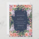 En djup marinblå bakgrund ger en slående kontrast till frodiga klasar av korallrosor och ömtåliga syrenblommor. Designen berikas av frodiga gröna ormbunkar och små bär som skapar ett tätt blomsterarrangemang. Denna stämningsfulla och sofistikerade palett erbjuder en romantisk estetik för ett säsongsbundet evenemang.