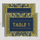 Dessa bordskort har en intrikat geometrisk ram, geometriska mönster, en marinblå och guld färgpalett och andra stilistiska detaljer som alla är inspirerade av Art Deco och det glada tjugotalet. Du kan anpassa exempeltextfälten efter eget tycke.