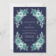 Denna design har en djup marinblå bakgrund som kombineras med svaltonade blommiga arrangemang i nyanser av teal och akva. Symmetriska grupperingar av rosor och frodiga peonior skapar en elegant och sofistikerad estetik. Ömtåliga blad och botaniska kvistar ger en känsla av rörelse till den polerade layouten. Perfekt för en formell kväll eller vinterevenemang.