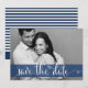 Ett modernt och stilfullt spara-datum-kort med fantasifull kalligrafiskrift och marinblå och vita ränder. Ett matchande tackkort finns tillgängligt.