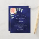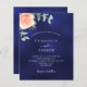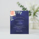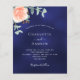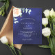 Marinblå bakgrund, den blå färgen är ojämn. Dekorerad med en roséguld- och blekrosa blomma, rosenblomma och gröna akvarellmålade eukalyptusblad, kvistar, grönska och falska guldgrenar. Anpassa och lägg till era namn och bröllopsdetaljer.