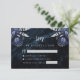 Detta eleganta bröllops-RSVP-kort har marinblå blomsterbuketter som kontrasteras med silverfärgad falsk foliegrönska i två hörn, på en bakgrundsbild av marinblå akrylfärg agat. Den anpassningsbara texten kombinerar silvergrå serif och handskrivna teckensnitt. Baksidan har en matchande marinblå och silverfärgad blomma och agat-design.