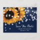 Marinblå rustika bröllops kortsparande datum postkort med solrosor på en marinblå burlap bakgrund. Idealisk kortdesign för ett marinblått rustikt bröllop inspirerat av solrosor.