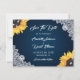 Rustika marinblå blomsterbröllopsfotografier sparar datumet kort med solrosor och vit blomsterspets på en marinblå gradientbakgrund. Anpassa enkelt detta kort med dina bilder och bröllopsdetaljer. Matchande artiklar finns tillgängliga. Bakgrunden kan ändras till valfri färg.