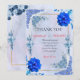 Uttryck din tacksamhet vackert med detta eleganta blå blomstermönstrade bröllopskort. Med mjuka marinblå och dammiga blå akvarellblommor kompletterar denna romantiska design perfekt klassiska och formella bröllopsteman.