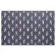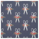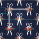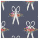 Marinblått tyg med ett mönster av blomma-smyckad vit scissors.