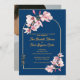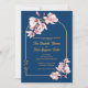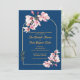 Elegant marinblå magnoliabrudsinbjudan med guldbåge och foto på baksidan.