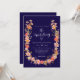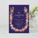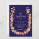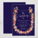 Elegant höstblommig marinblå och vit bröllopsinbjudan med en vacker handmålad vildblomsterkrans i rika höstfärger och elegant modernt skrivsätt. Perfekt för ett marinblått och vitt tema-bröllop, denna bohemiska rustika blommiga inbjudan kombinerar naturlig charm med konstnärlig sofistikation.