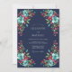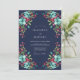 Denna design har en djup marinblå bakgrund prydd med livfulla akvatintblommor i teal och rika burgunderröda bär. Eleganta gröna bladkluster i hörnen skapar en sofistikerad och dyster estetik. Kontrasten mellan svala akvatinttoner och varma karmosinröda accenter gör den idealisk för en vinter- eller sensommarceremoni. Den måleriska stilen ger en romantisk och konstnärlig atmosfär.