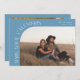 Modern and stylish save the date card featuring a text that says "mark your calendars" along the curved frame photo. One photo in the front and one on the back. The background is denim blue.