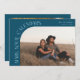 Modern and stylish save the date card featuring a text that says "mark your calendars" along the curved frame photo. One photo in the front and one on the back. The background is teal.