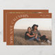 Modern and stylish save the date card featuring a text that says "mark your calendars" along the curved frame photo. One photo in the front and one on the back. The background is terracotta.