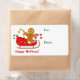 Den här etiketten för julklapp innehåller en söt märkre av en dekorerad Pepparkaksgubbe i ett rött sled. Förutom honom är han olika färgader, stripade polkagrisar. I texten under bilden står "Glad helg" i rött och på sidan står "För" och "Från" i grönt. All text anpassas enkelt av dig. Roligt, särskilt för barn!