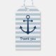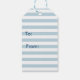 Märkre med ljusblå och vit strimmig gåva med blå fästpunkt och tack för texten på framsidan. På andra sidan av dessa presenterade märkre finns anpassadet som du kan använda för att inkludera till- och Från-information. Du kan anpassa de här märkrna med den text du vill ha tillsammans med färg och teckensnittet.