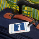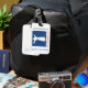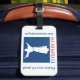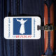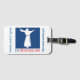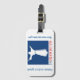 Bagagemärkre med US-Franciscans logotyp, websiteadress, "fred och all bra," och en springa för en visitkort.