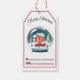 Den här charmerande märkrn i helgdag visar en underbar snö-glob med ett rött lastbil parkerat framför ett mysigt hus, omgivet av snö-täckt träd, perfekt för festlig gåva.