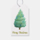 En vattenfärg Julgran med blå bubblor, målad av mig, och ord "God jul" under den i ett trendig med kalligrafteckensnitt. Denna märkre av gåvor förmedlar den mysiga julstämningen. Märkrns baksida är tom för att du ska kunna skriva meddelandet till mottagaren.