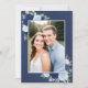 Den här vackra bröllopsinbjudan är designad att gå under en vellumtäcke. Den har en vacker boho-chic med ditt foto på en marmorerad dammig marin marin marin marin marin marin marin marin marin marin marin marin blå bakgrund omgiven av ett antal handmålade vattenfärger ro i skuggor av dammig blått, marin och indigo. Baksidan är ett lush marmorerat blått färg med ett kluster av samma blommor.